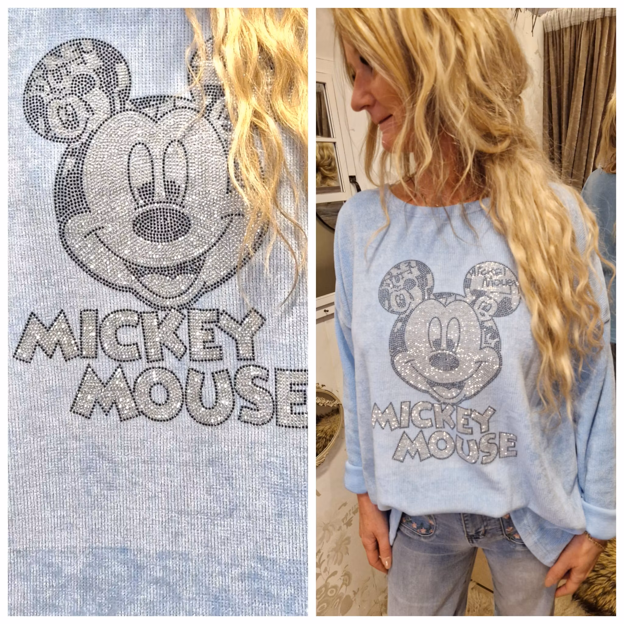 Moondust babycord genser med Mikke Mus. Genseren er litt lengre bak enn foran og god one size størrelse som passer fra størrelse S til XL. Myk polyester og elastane kvalitet.