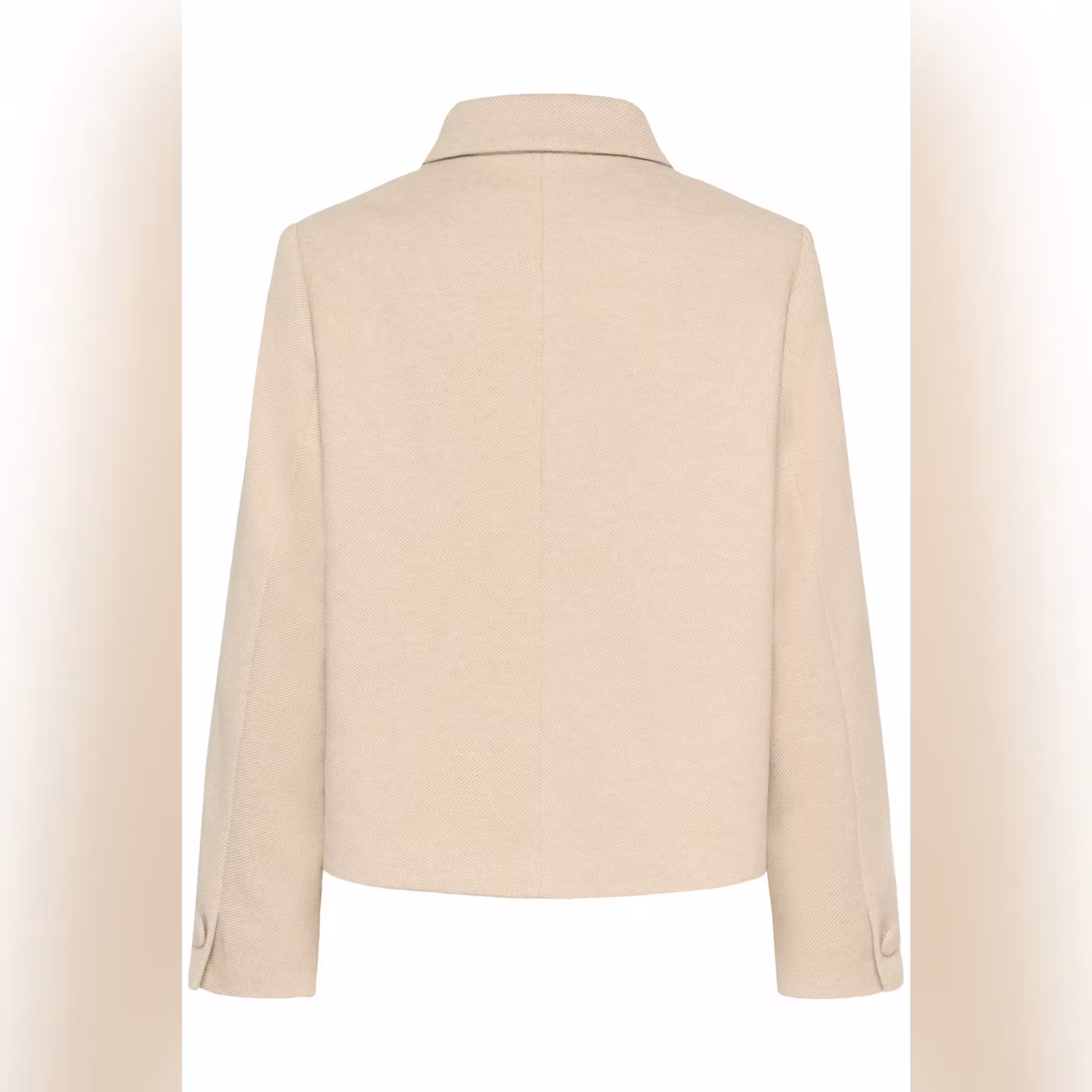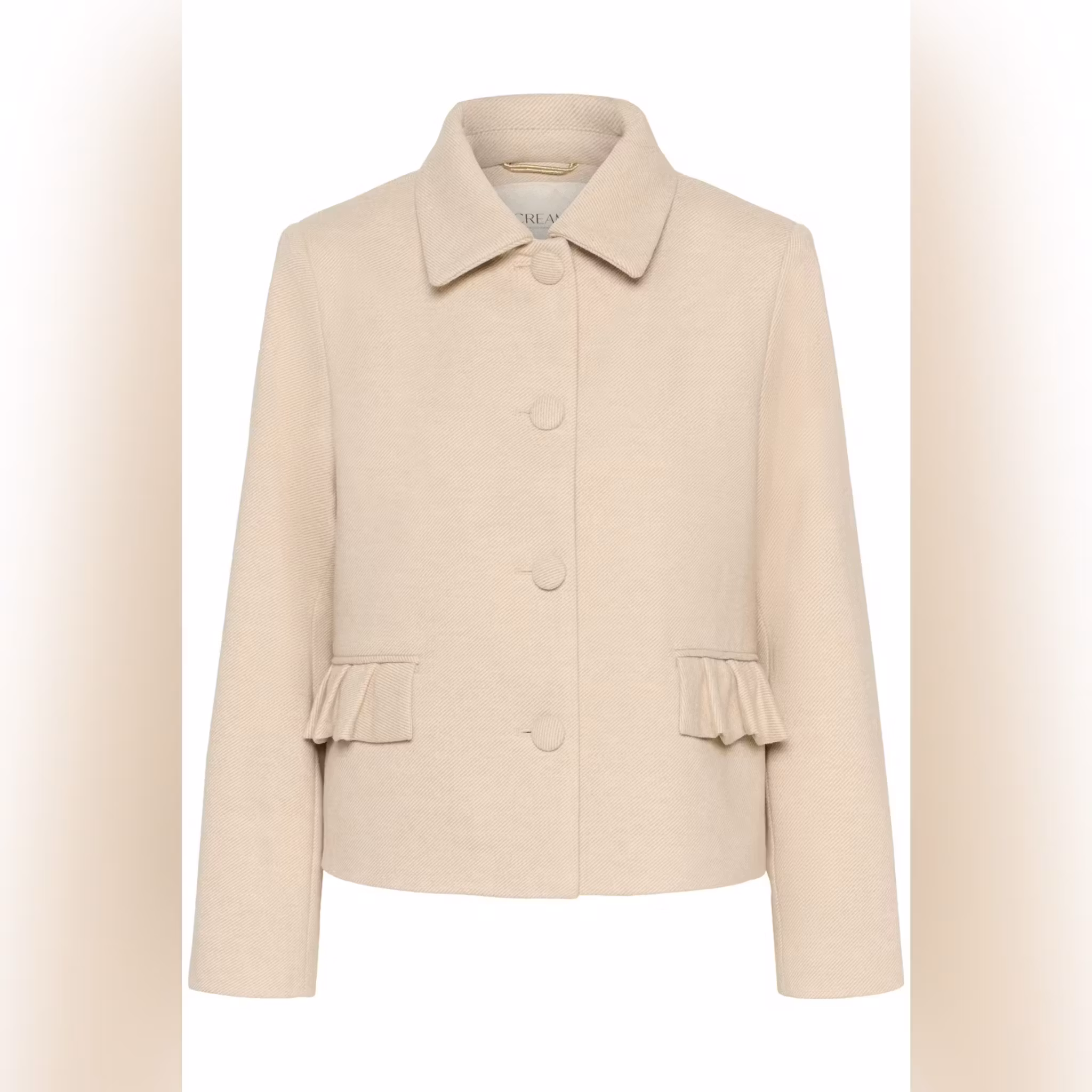 Kort jakke for dame med rett passform, klassisk skjortekrage og knappelukking. Lange ermer og volangdekkede lommer gir stilren komfort til enhver anledning.