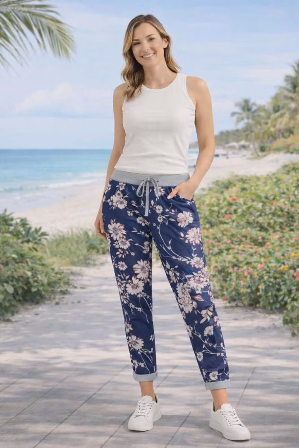 Tøff og superbehagelig bukse med strikk og snor I linning . Gode lommer. Buksa er I myk bomullskvalitet. Den kan brettes opp til caprijeans og brukes hele sommeren. God one size størrelse som passer fra XS til XL