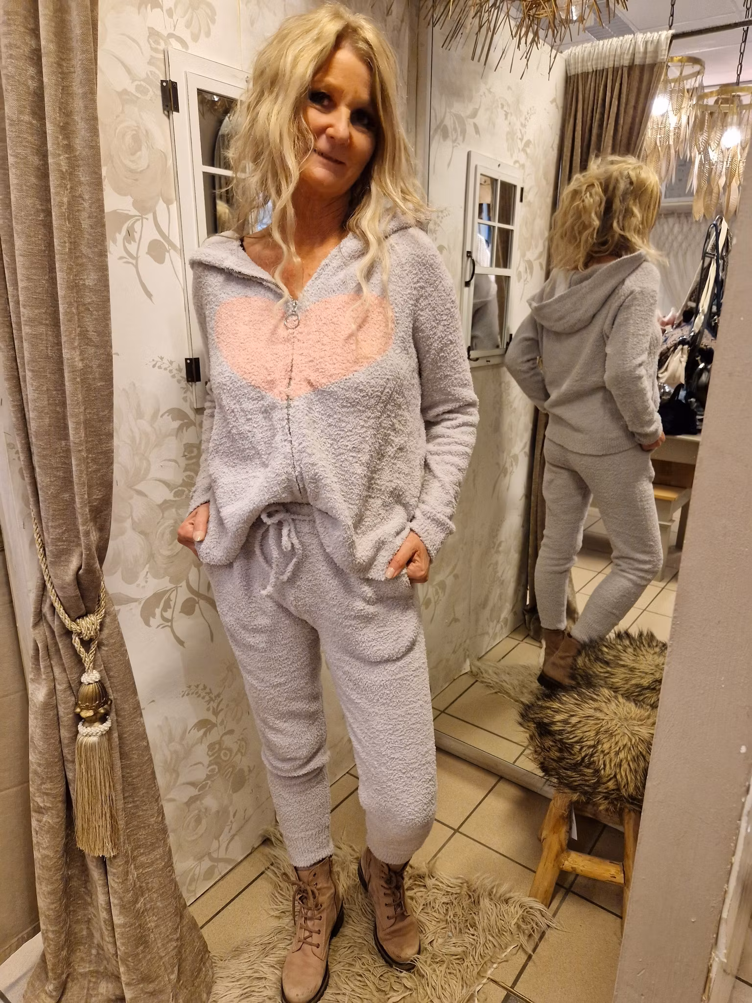 Denne dressen er helt nydelig å ha på seg.🩷 Fluffy supermyk fleece/ frotte kvalitet. ( polyester) Genser med glidelås og hette .bukse med lommer og strikk og snor I midjen. Fra Paris. Fineste kosedressen